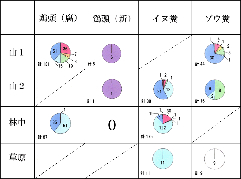| 序 奈良公園内には多数のシカが生息している。さて、このシカの糞はどのように処理されるのだろうか。実はこれは、様々な種類の虫、菌類、微生物などによって分解され、やがて土に還るのである。我々高津高校生物研究部はこの『分解屋』、特に糞食性コガネムシ類の生態について興味を持った。彼らは直接シカなどの動物の糞を餌にする、いわば『第一次分解屋』である。一体この虫たちはどんな食性を持ち、どんな場所に多く生息するのだろうか?以下の研究では、主にこの疑問に焦点を当てて考察していきたいと思う。 糞食性コガネムシ類とは、鞘翅目のコブスジコガネ科、マンマルコガネ科、センチコガネ科、アツバコガネ科、アカマダラセンチコガネ科、ニセマグソコガネ科、マグソコガネ科、コガネムシ科のダイコクコガネ亜科に属する昆虫のことで、日本には150種余り生息している。今回の調査で捕獲できた糞食性コガネムシ類は、 ルリセンチコガネ・センチコガネ・ゴホンダイコクコガネ・マエカドコエンマコガネ・ カドマルエンマコガネ・コブマルエンマコガネ・ツヤエンマコガネ・フトカドエンマコガネ・マグソコガネの9種類であった。 調査方法 糞食性コガネムシ類の生態を研究するため、奈良公園内の山中2ヶ所、林中、林と芝生の境界、芝生の計5ヶ所それぞれの地面に、6種類の餌(腐らせた鶏頭、新鮮なままの鶏頭、腐らせたシイタケ、新鮮なままのシイタケ、イヌ糞、ゾウ糞)を入れた紙コップと、対照として餌を何も入れない空の紙コップ、計7個の紙コップトラップを設置した。このトラップを一晩放置して虫を捕獲し、場所・餌による個体数の差を比較した。