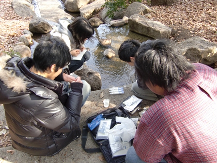 | 内濠の様子(東) | 内濠の様子(西) | せせらぎ調査の様子 | 亜硝酸態チッ素の反応色 |