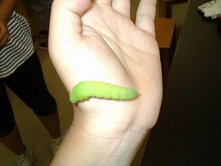 3年生が、アオスジアゲハの幼虫を持ってきてくれました。クスノキの葉を与えても食べないので、