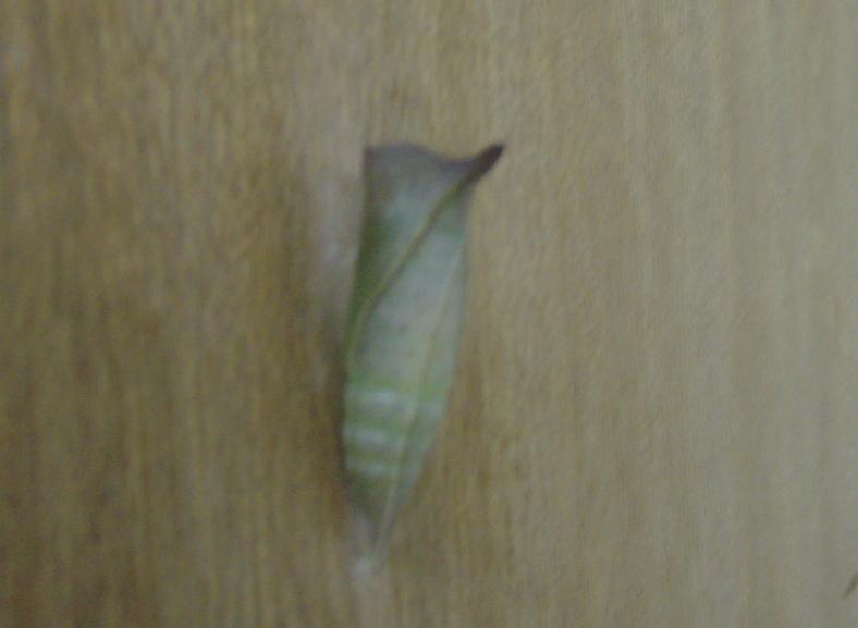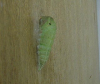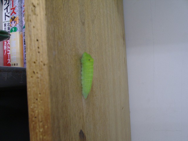 本棚の側面に這わせたら、糸を吐き、大人しくなって、蛹になってしまいました。