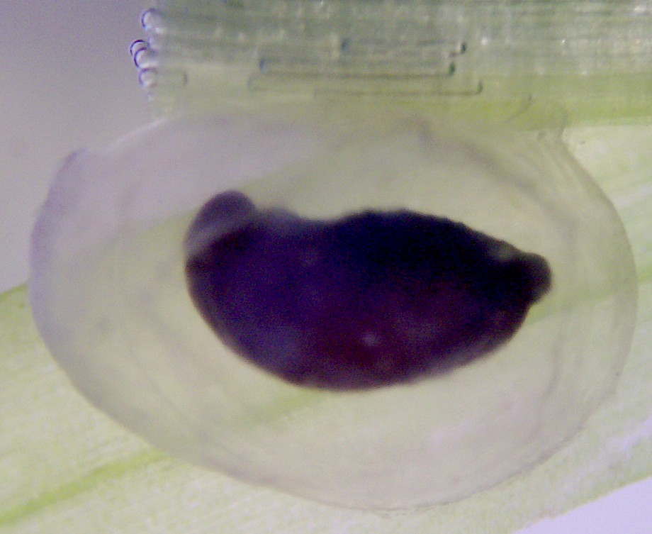 オオカナダモに生んだ、アカハライモリの卵が神経胚になっていました。