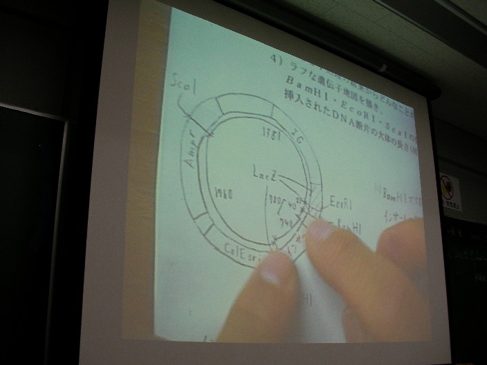 最後の実験結果と考察の発表の時には、きちんとデータを見て計算することの重要性、思い込みの怖さを知りました。例えば、ある人が作ったプラスミドでは、インサートのpUC119に対する向きは、ScaTの切断部位を考慮して、電気泳動の結果から計算しなければわかりませんでした。